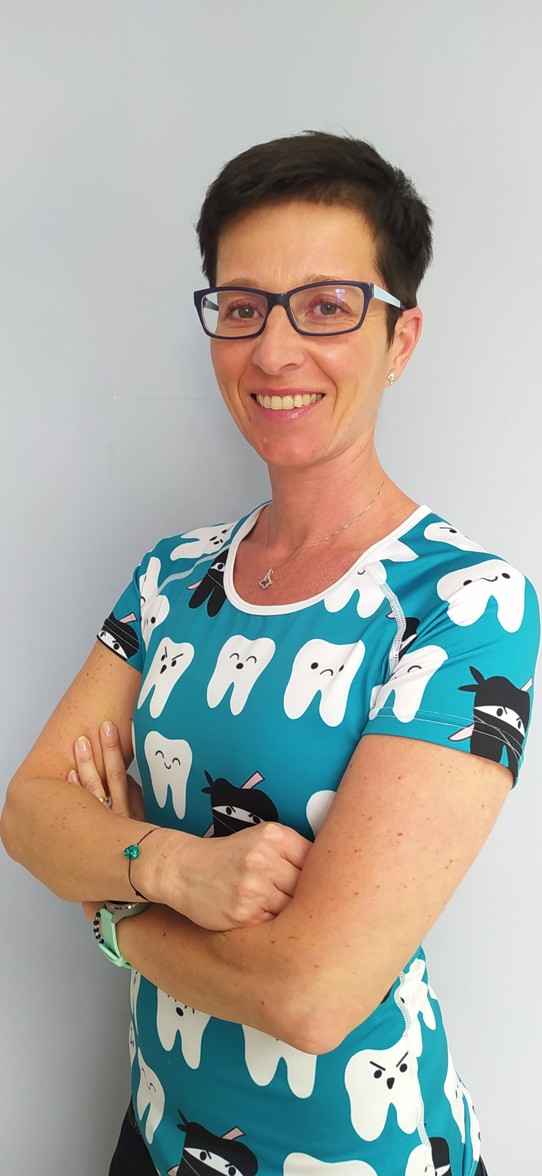 Jsem vystudovaná dětská sestra a po několikaleté praxi na chirurgii jsem shodou šťastných i nešťastných okolností nastoupila na ortodoncii. Byl to pro mě zcela neznámý obor a byla to láska až na druhý pohled. Na své práci mám ráda, že je velmi pestrá, stále se objevují nové věci a nedává mi možnost zajet do stereotypu. Také ráda pracují s lidmi. Ve volném čase se věnuji sportovním aktivitám.